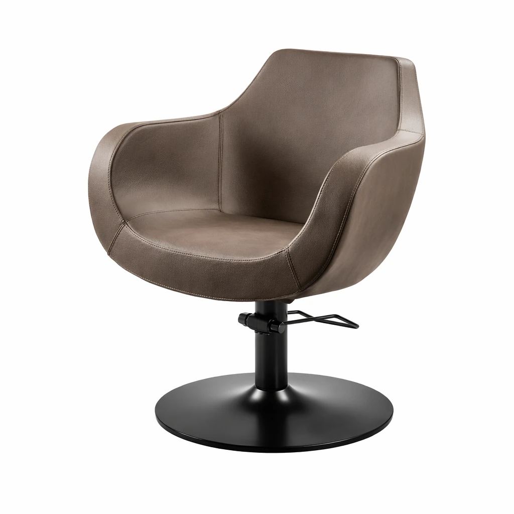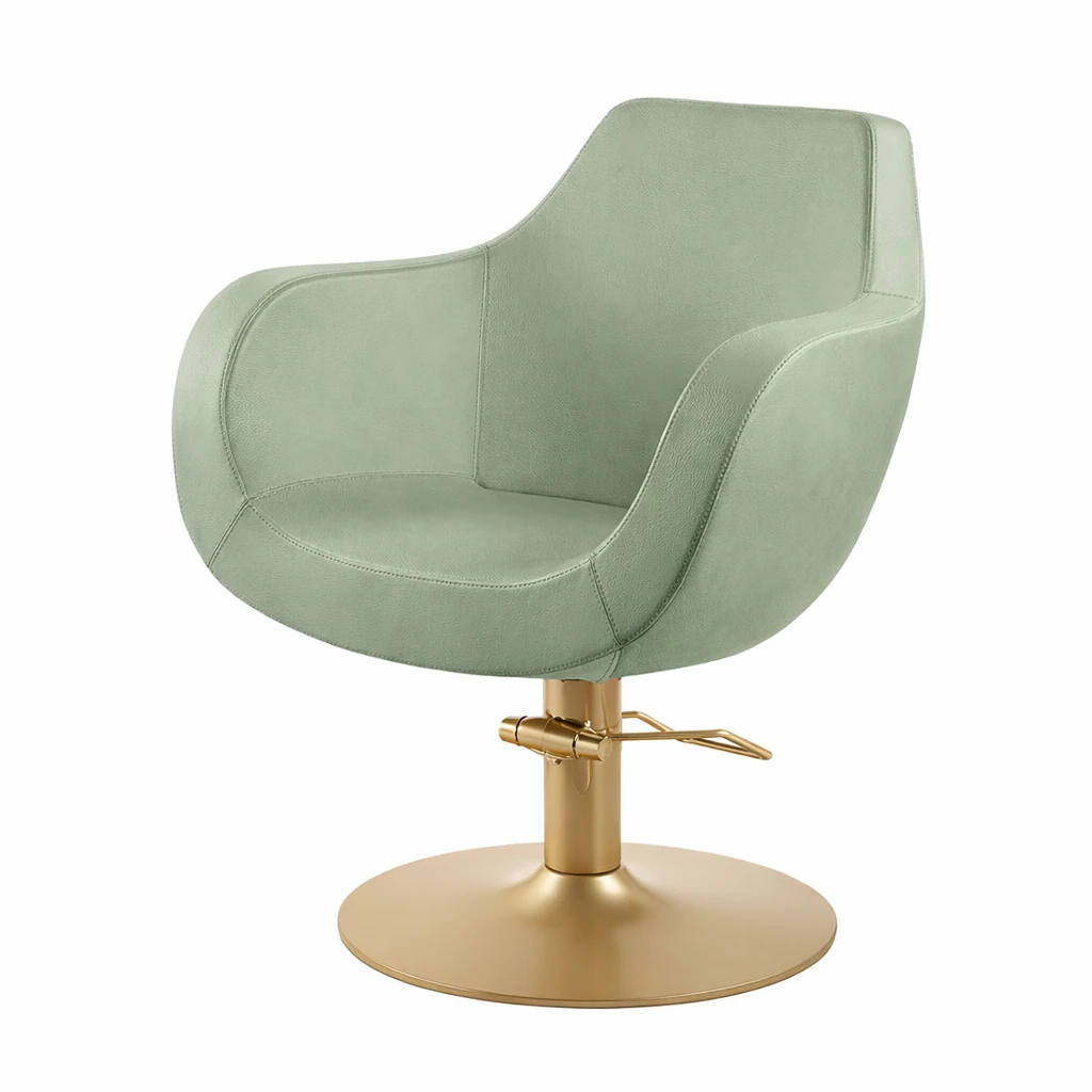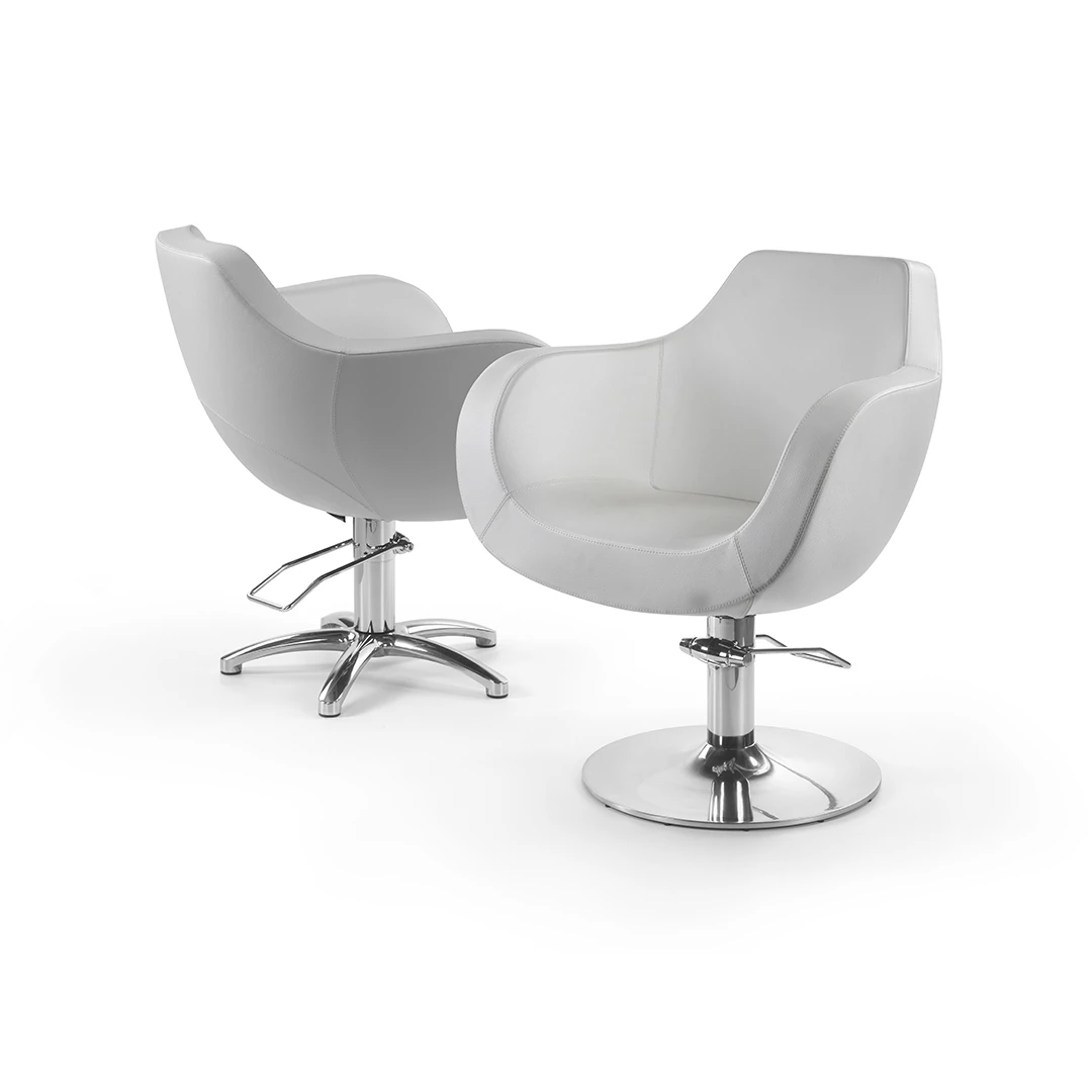 La base può essere configurata con piede tondo o piede a stella, disponibili nelle finiture grigio, nero o oro, per valorizzare l’estetica complessiva del salone e coordinarsi con gli altri elementi di arredo. Stabilità, affidabilità e cura dei dettagli rendono questa poltrona una soluzione versatile e duratura.