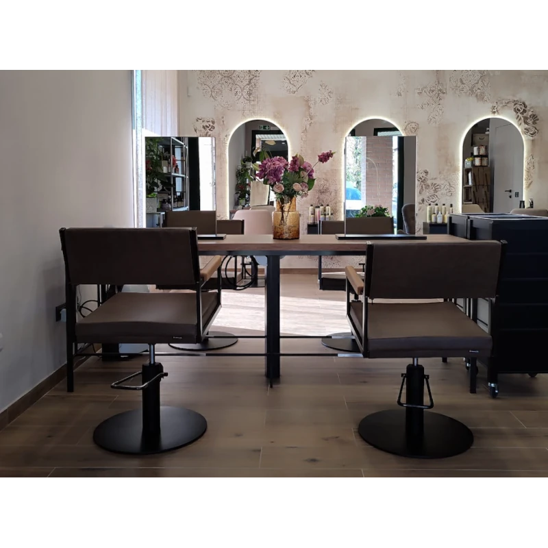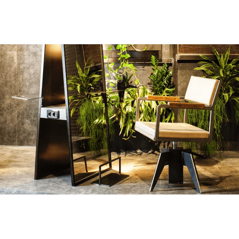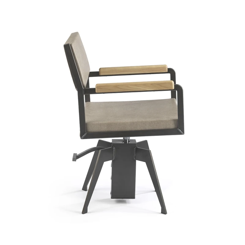 Questa poltrona da parrucchieri in stile industriale è la scelta ideale per saloni che desiderano un design deciso e contemporaneo all’interno del proprio progetto di arredamento parrucchieri. Gli elementi in ferro e legno a vista conferiscono un carattere forte e professionale, perfetto per ambienti moderni, urban e in stile eco-green.